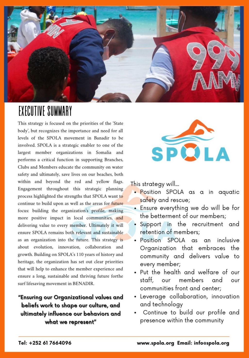 SPOLA is a strategic enabler to one of the largest member organizations in Somalia and performs a critical function in supporting Branches, Clubs and Members educate the community on water safety and ultimately, save lives on our beaches, both within and beyond the red and yellow flags